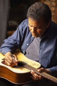 Charley Pride signs a Martin D-28 guitar. Pride is among the 76 of the 101 country music artists interviewed for the series who signed two Martin D-28 guitars. (Photo courtesy of Craig Mellish)